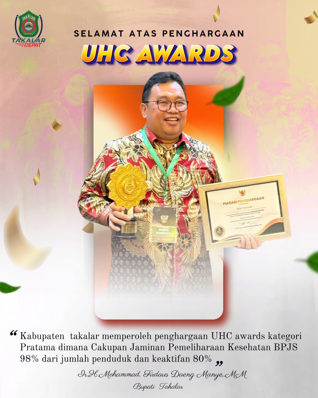 Pemerintah Kabupaten Takalar berhasil meraih penghargaan Universal Health Coverage (UHC) Awards kategori Pratama atas capaian kepesertaan Jaminan Kesehatan Nasional (JKN) melalui BPJS Kesehatan yang hampir menyeluruh.