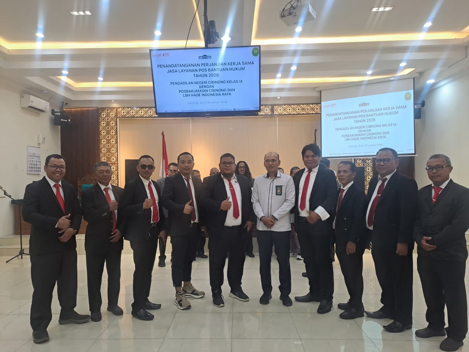 Sugeng juga menyampaikan rasa bangga serta mengucapkan selamat kepada LBH Hade Indonesia Raya dan Posbakumadin Cibinong yang telah dipercaya untuk bersinergi bersama Pengadilan Negeri Cibinong Kelas IA dalam memberikan layanan bantuan hukum kepada masyarakat pada tahun 2026.