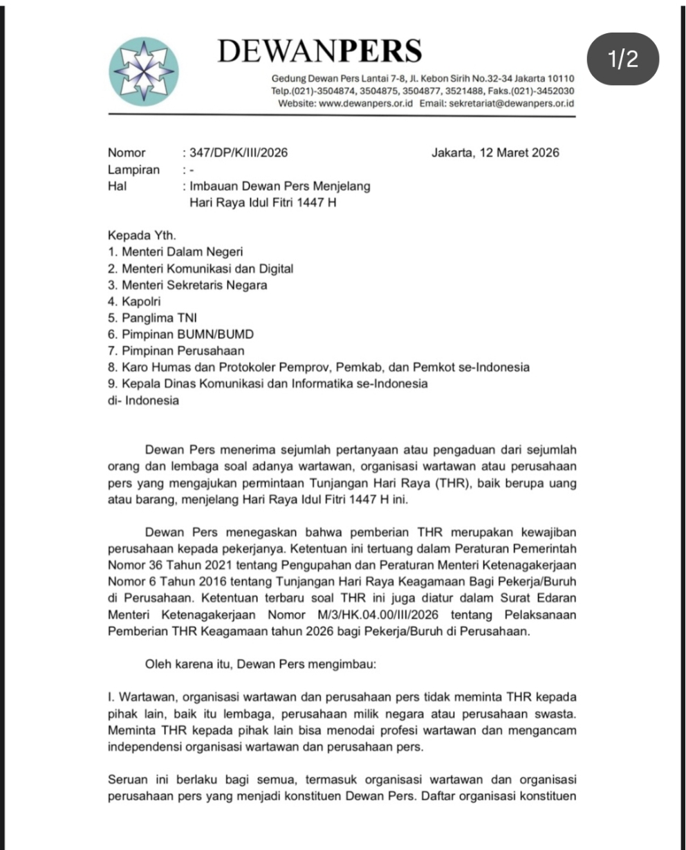 Inpopedia, Jakarta – Dewan Pers mengeluarkan imbauan kepada wartawan, organisasi wartawan, dan perusahaan pers agar tidak meminta Tunjangan Hari Raya (THR) kepada lembaga pemerintah, BUMN, maupun perusahaan swasta menjelang Hari Raya Idul Fitri 1447 Hijriah.